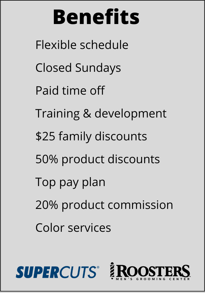 Our guests include men, women, and children. Use all your skills cutting, coloring, waxing, and styling. Our stylists can handle it all. Locally owned and managed, we're passionate about taking care of our stylists. Our culture is supportive, positive, and upbeat. We want to be the top salon for you to advance and grow in your beauty career. Our salons are pristine, fresh, and bright.